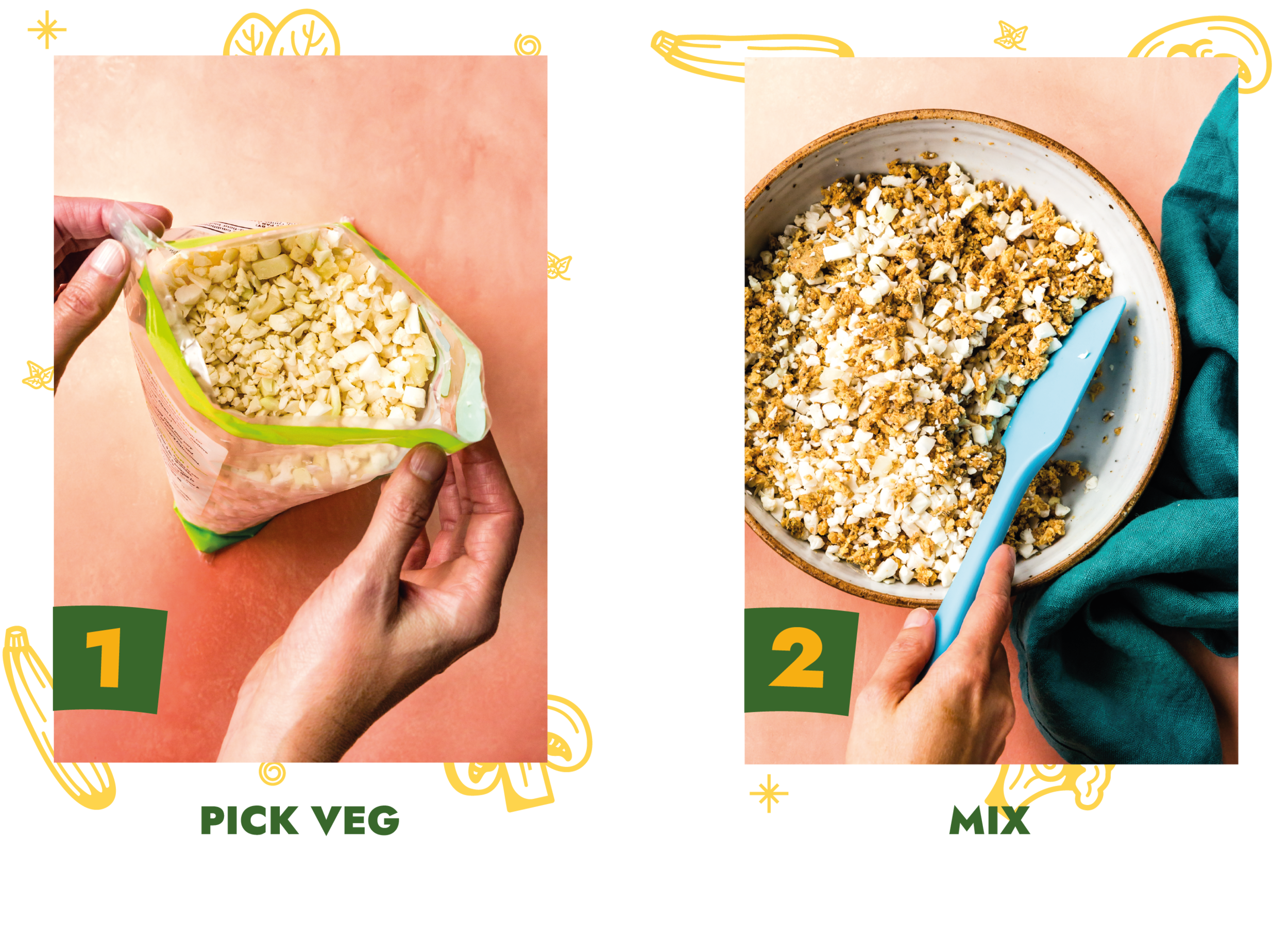 Fold in 2 cups of your prepared veggie. Our favorites for a crumble are riced cauliflower, diced mushrooms or grated carrots.