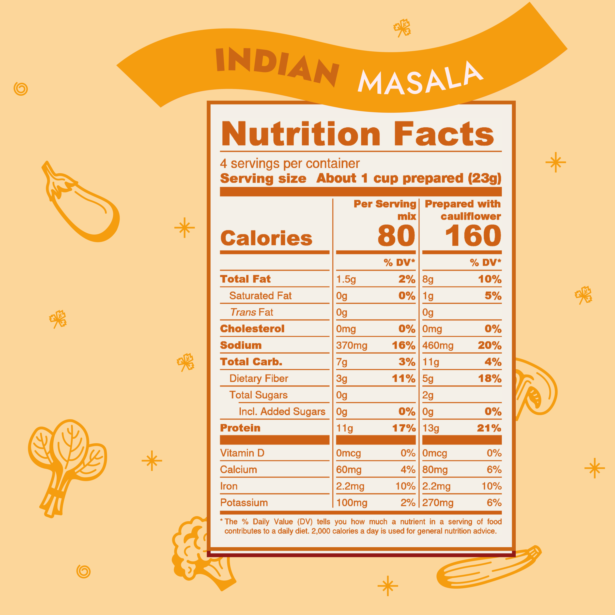Pea protein, corn starch, psyllium husk, organic cornmeal, Kashmiri red chili powder, tomato powder, turmeric powder, salt, toasted onion powder, garlic powder, ground coriander, ground cumin, amchur powder (green mango), sunflower lecithin, ginger powder